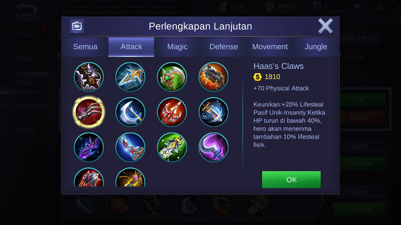 Haas’s Claws adalah item yang paling penting dikarenakan bisa membantu hero-mu tetap hidup dengan mendapatkan beberapa persen HP ketika membunuh jungle monster ataupun minions. Jika kalian sudah punya item ini, kamu tidak perlu lagi bolak-balik ke base untuk mengisi HP, cukup serang minions maka HP akan bertambah dengan sendirinya. Selain itu Haas’s Claws juga menambah +70 Physical Attack.