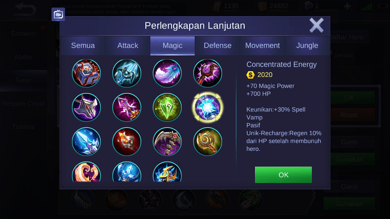 Item yang satu ini mirip dengan Haas’s Claws, yakni mampu menambah HP dari membunuh monster atau minions. Namun bedanya itemini khusus buat para Mage, sedangkan Haas’s Claws buat para Fighter atau Marksman. Selain itu, Concentrated Energy juga memberikan tambahan +700 HP serta regen 10% dari HP ketika membunuh hero musuh.