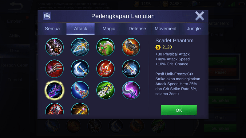User Marksman pasti kenal dengan item yang satu ini. Yap! Scarlet Phantom mampu menambah sebesar +40% Attack Speed, +30 Phisycal Attack, serta +10% Critical Chance. Setelah membeli item ini, attack speed hero yang kamu gunakan akan meningkat drastis. Hero Marksman selalu menggunakan item ini untuk menambah attack speed-nya, dan terkadang hero-hero Fighter dan Assasin juga sering menggunakannya.