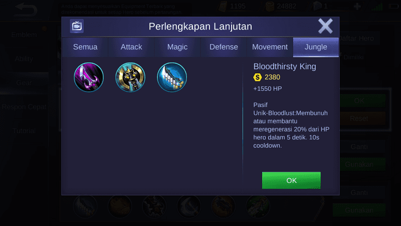 Item-item jungle seperti Hunter’s Knife, Nimble Blade dan Pillager Axe akan sangat berguna di awal pertandingan. Kegunaan dari item tersebut adalah meningkatkan damageterhadap monster-monster hutan sehingga farming menjadi lebih cepat. Selain itu kamu juga akan mendapatkan beberapa persen HP ketika membunuh monster hutan. Itulah alasan kenapa item jungle sering digunakan para Assasin, Marksman, Fighter, maupun Mage.