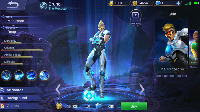 Dulunya Bruno sering menjadi hero Marksman andalan karena ia adalah salah satu Marksman yang cukup lincah, dibandingkan Marksman lain yang tergolong lambat pergerakannya. Namun sekarang Bruno sudah jarang digunakan, para User Marksman lebih memilih untuk menggunakan Layla, Karrie, Irithel, dan Yi Sun-shin.