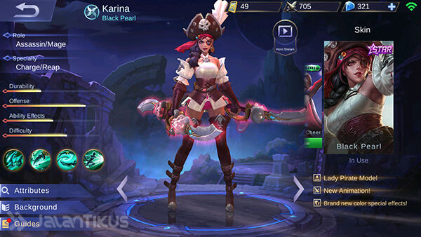 Selanjutnya ada Karina. Hero Mage Assassin ini bertugas untuk mengeksekusi musuh terutama damage dealer yang memiliki darah kurang dari setengah.